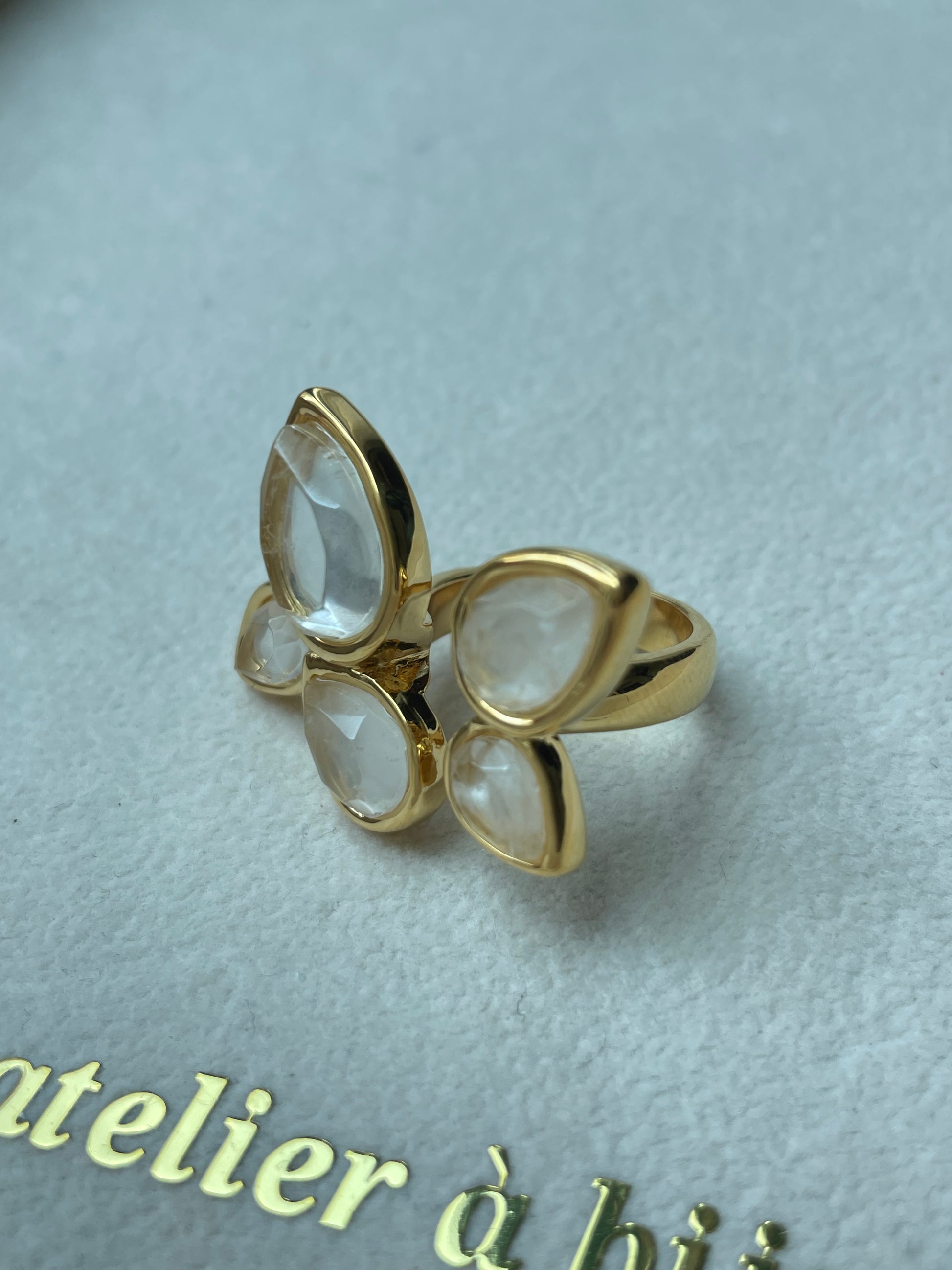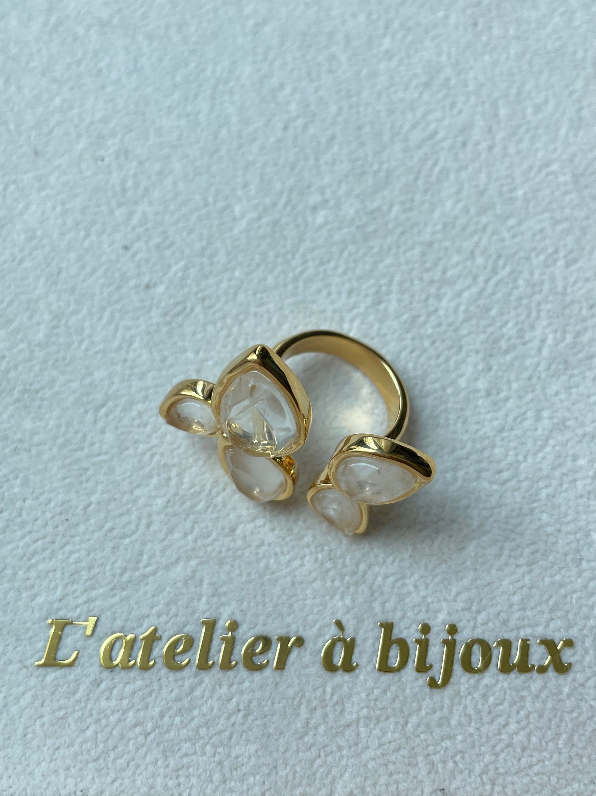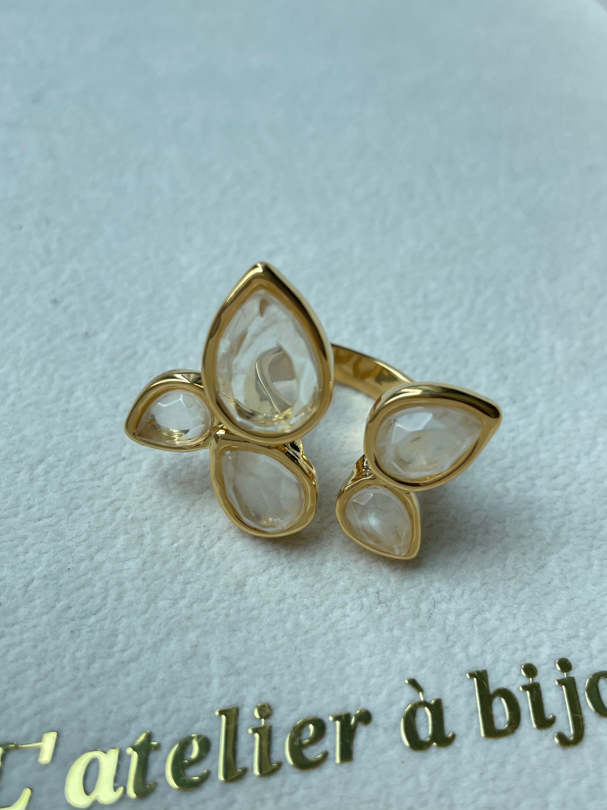 Chiếc nhẫn nổi bật với thiết kế năm giọt đá dáng giọt lệ được sắp xếp hài hòa, mang vẻ đẹp vừa mềm mại vừa cá tính. Mỗi viên đá trong suốt được cắt facet tinh xảo, bao bọc bởi viền mạ vàng 14k sang trọng, tạo nên sự tương phản đầy cuốn hút giữa ánh vàng ấm áp và độ trong trẻo của đá.
