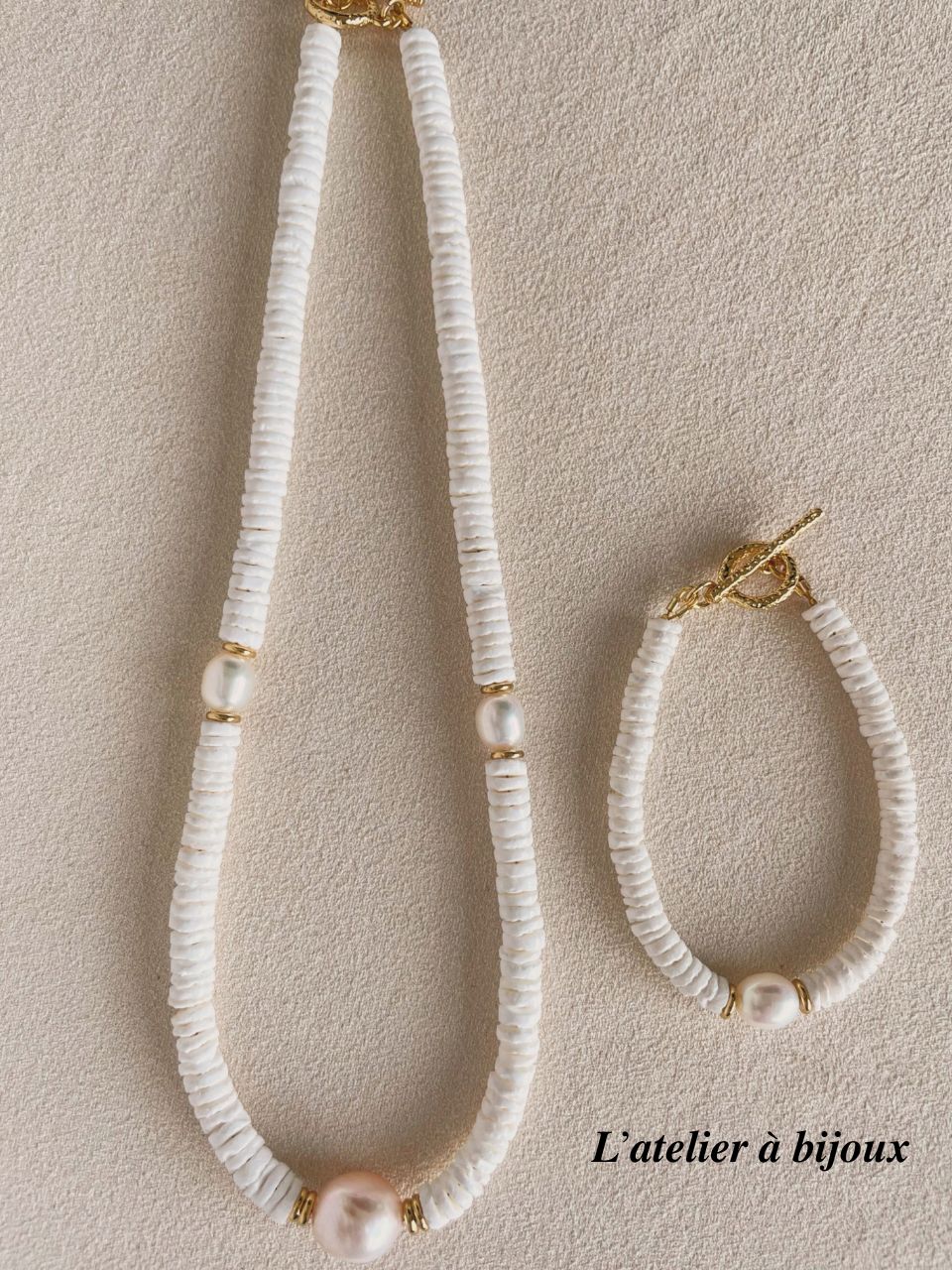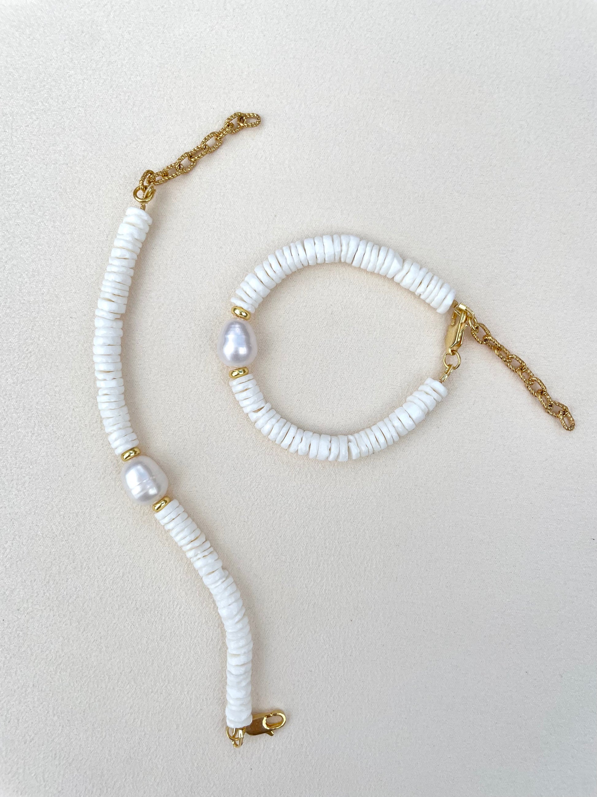 Chiếc vòng tay được thiết kế tinh tế từ những hạt vỏ sò trắng tự nhiên, điểm nhấn là viên ngọc trai nước ngọt cao cấp ở trung tâm. Sự hòa quyện giữa sắc trắng thanh khiết và chi tiết kim loại mạ vàng 18k mang đến vẻ đẹp sang trọng nhưng vẫn giữ được nét phóng khoáng và gần gũi với thiên nhiên. Đây là món phụ kiện lý tưởng để tôn lên vẻ thanh lịch trong nhiều phong cách khác nhau.