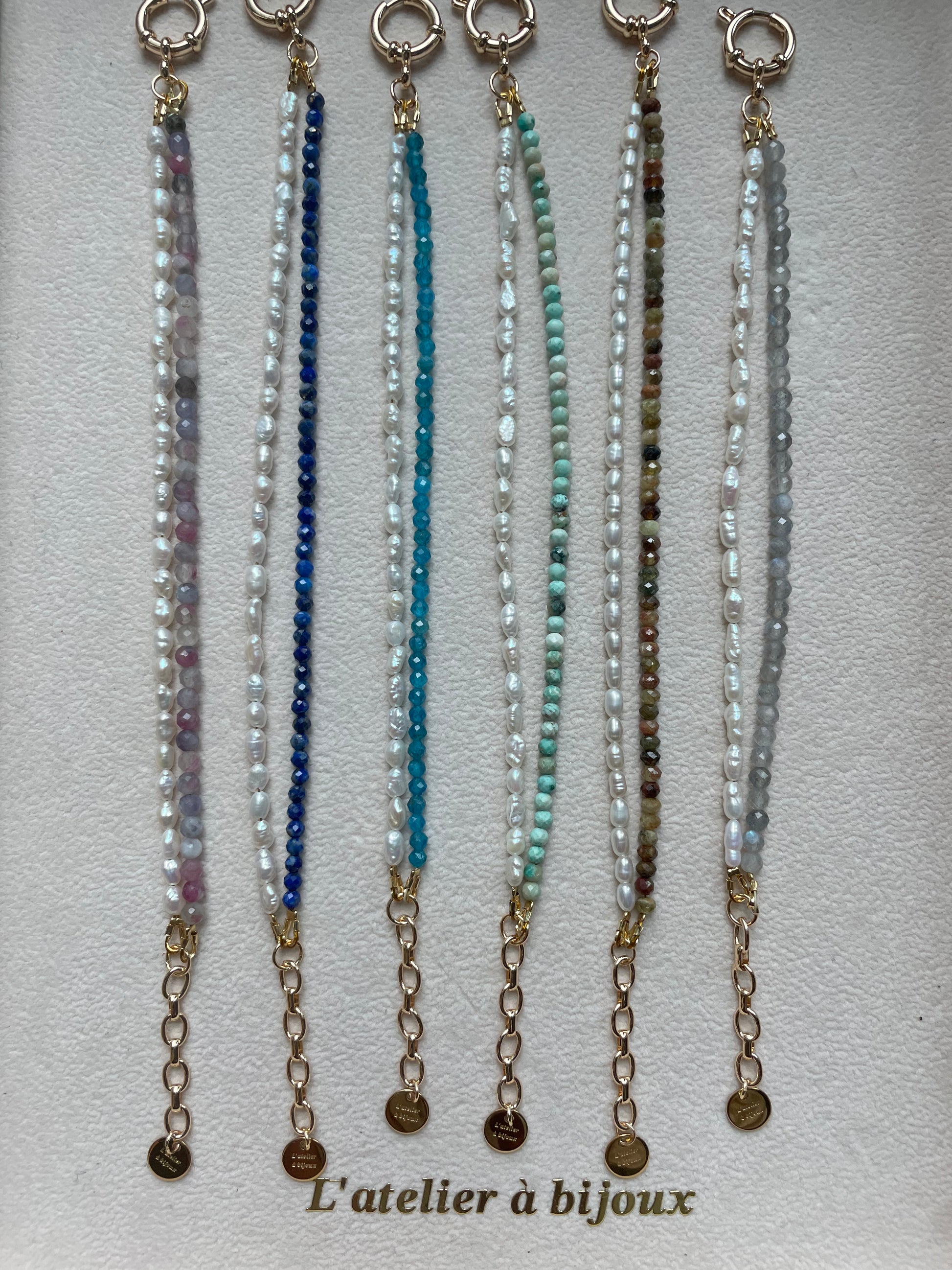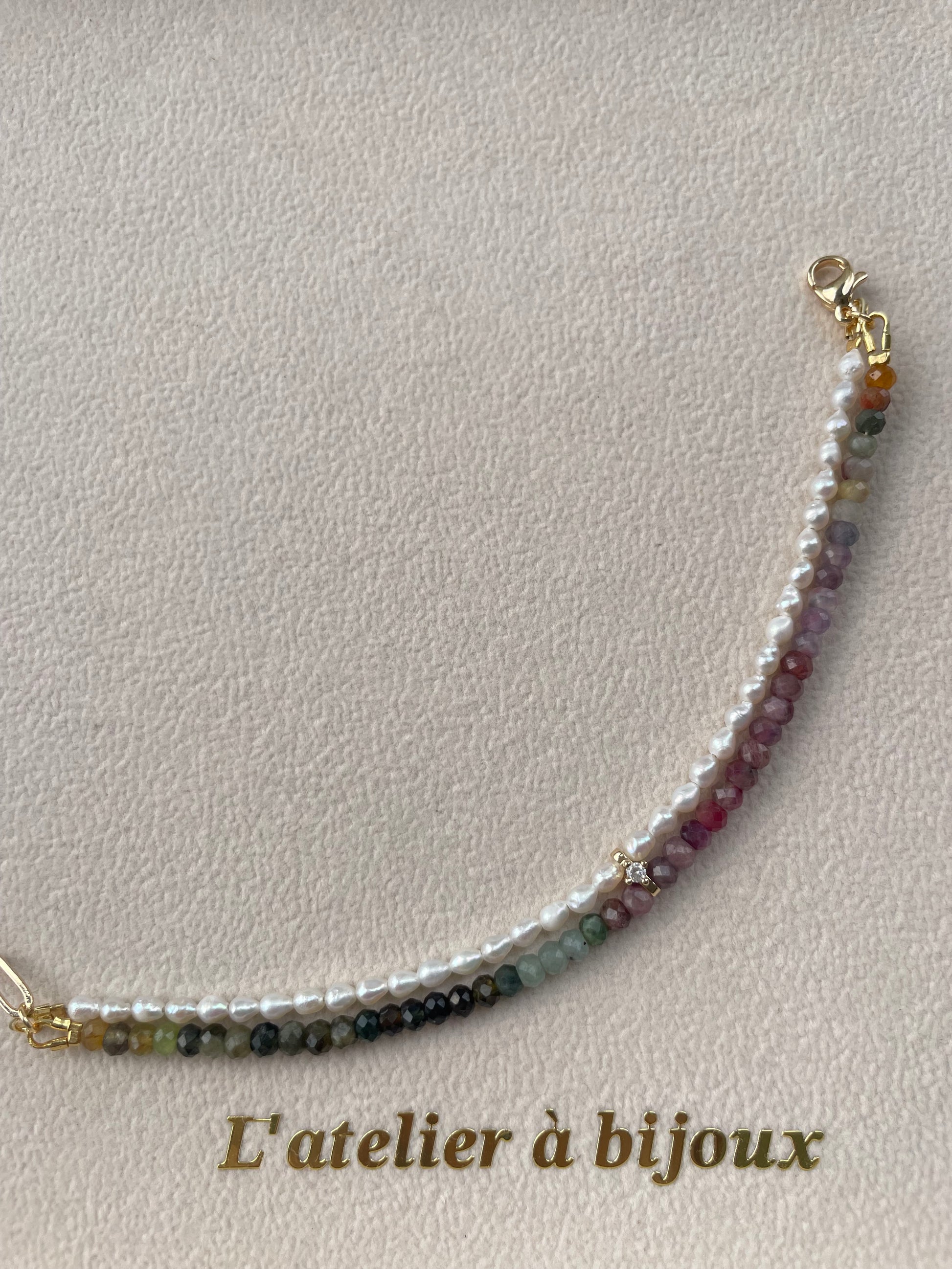 Những chiếc vòng tay nổi bật với thiết kế thanh mảnh và tinh tế, kết hợp hài hòa giữa hạt đá cắt facet nhiều màu sắc và ngọc trai trắng tự nhiên, mang đến sự đa dạng trong phong cách. Mỗi chiếc vòng đều được hoàn thiện với charm logo thương hiệu nhỏ tinh xảo, tạo điểm nhấn sang trọng và khẳng định dấu ấn riêng biệt.