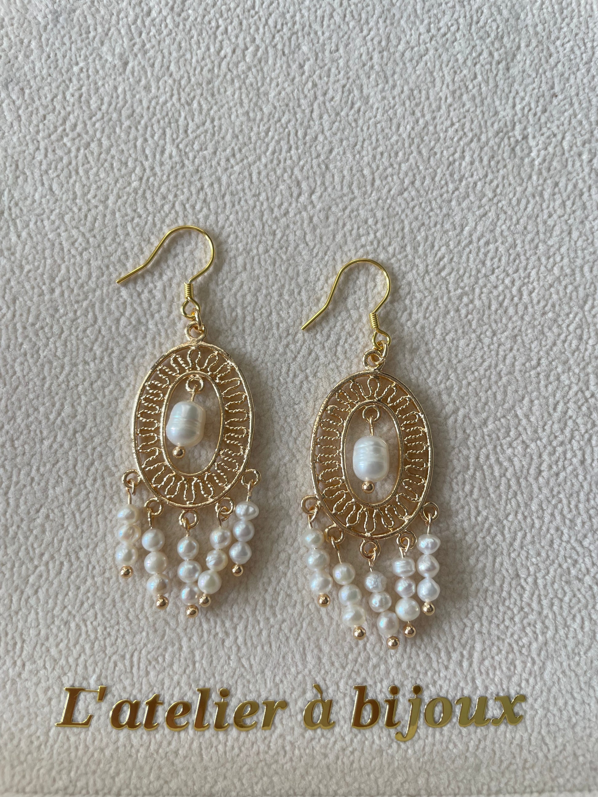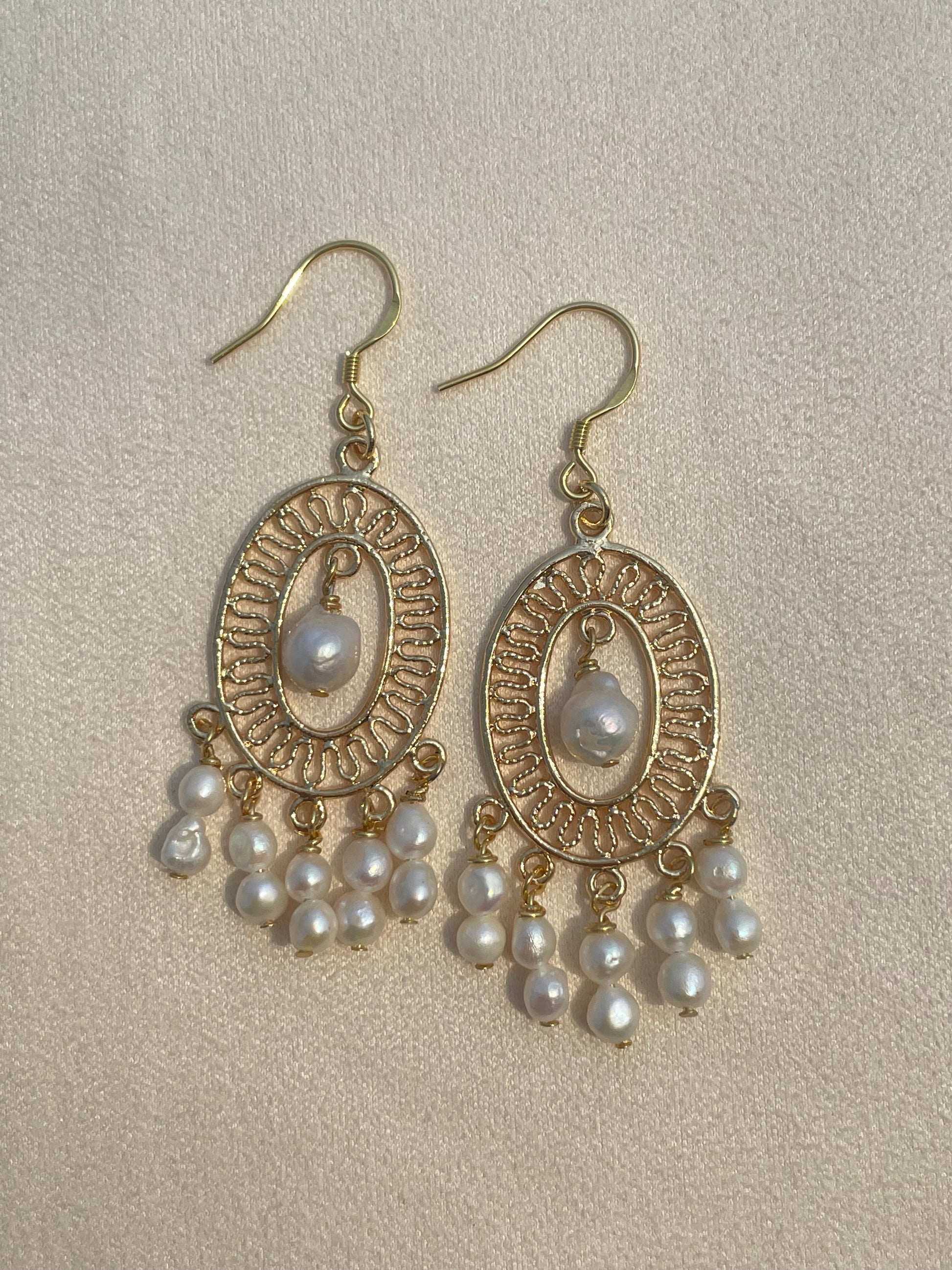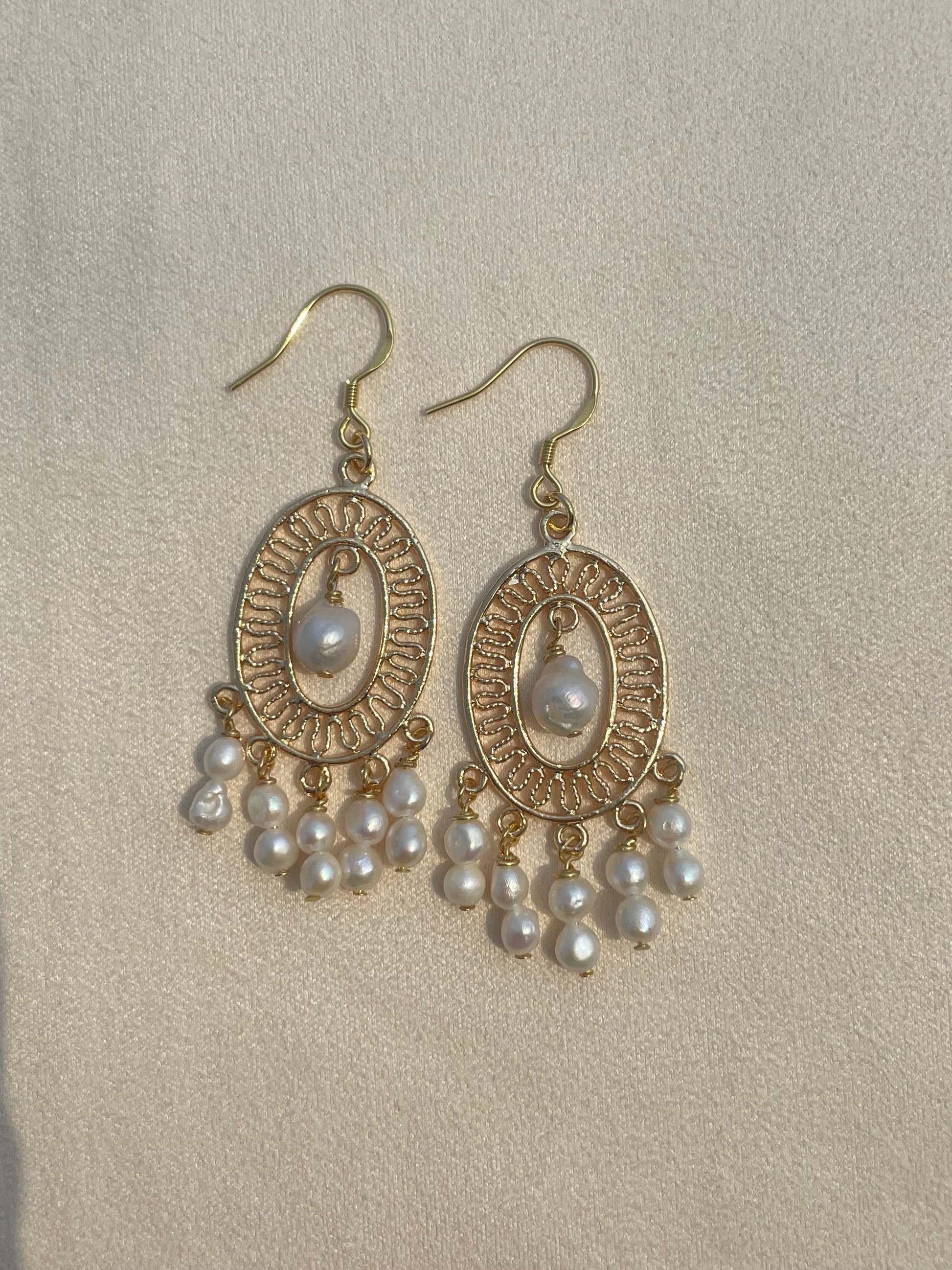 Đôi hoa tai vàng ngọc trai này mang thiết kế mặt oval chạm khắc tinh xảo, kết hợp hài hòa với viên ngọc trai nước ngọt nổi bật ở trung tâm và những chuỗi ngọc trai nhỏ thả rủ mềm mại bên dưới. Được chế tác từ kim loại mạ vàng 18k cao cấp, sản phẩm toát lên vẻ đẹp quý phái và thanh lịch, phù hợp cho nhiều phong cách từ hiện đại đến cổ điển.