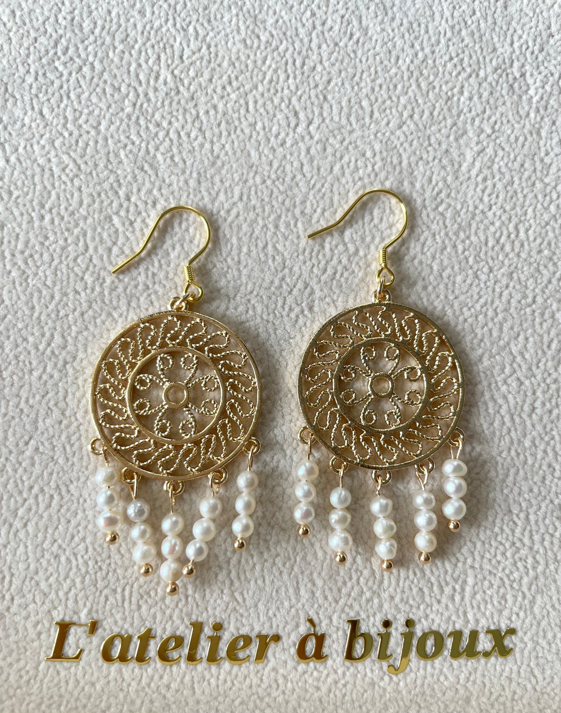 Đôi hoa tai vàng ngọc trai này mang đậm vẻ quý phái và tinh xảo với thiết kế mặt tròn chạm khắc hoa văn tỉ mỉ trên nền kim loại mạ vàng cao cấp. Những chuỗi ngọc trai nước ngọt tự nhiên thả rủ mềm mại tạo điểm nhấn duyên dáng, giúp đôi hoa tai trở nên nổi bật và sang trọng. Đây là lựa chọn hoàn hảo để hoàn thiện phong cách thanh lịch và nữ tính của bạn.