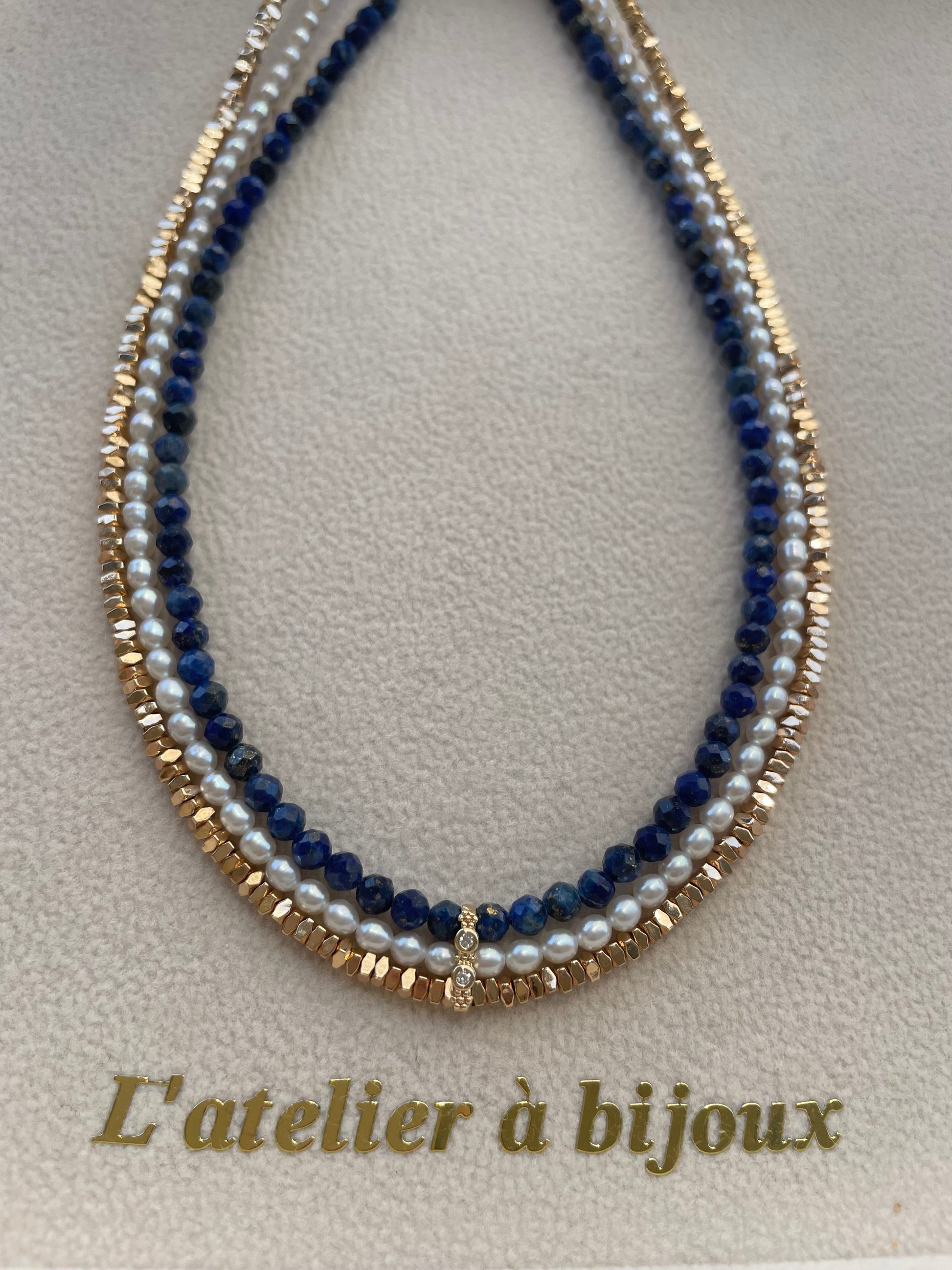 Từng viên đá Lapis Lazuli được cắt facet tỉ mỉ, bắt sáng tinh tế, xen kẽ với những viên ngọc trai trắng mềm mại và hạt vàng ánh kim cao cấp. Thiết kế mang đến chiều sâu và độ bắt mắt, giúp dễ dàng trở thành tâm điểm cho mọi phong cách – từ outfit thường ngày thanh lịch đến trang phục dự tiệc nổi bật.